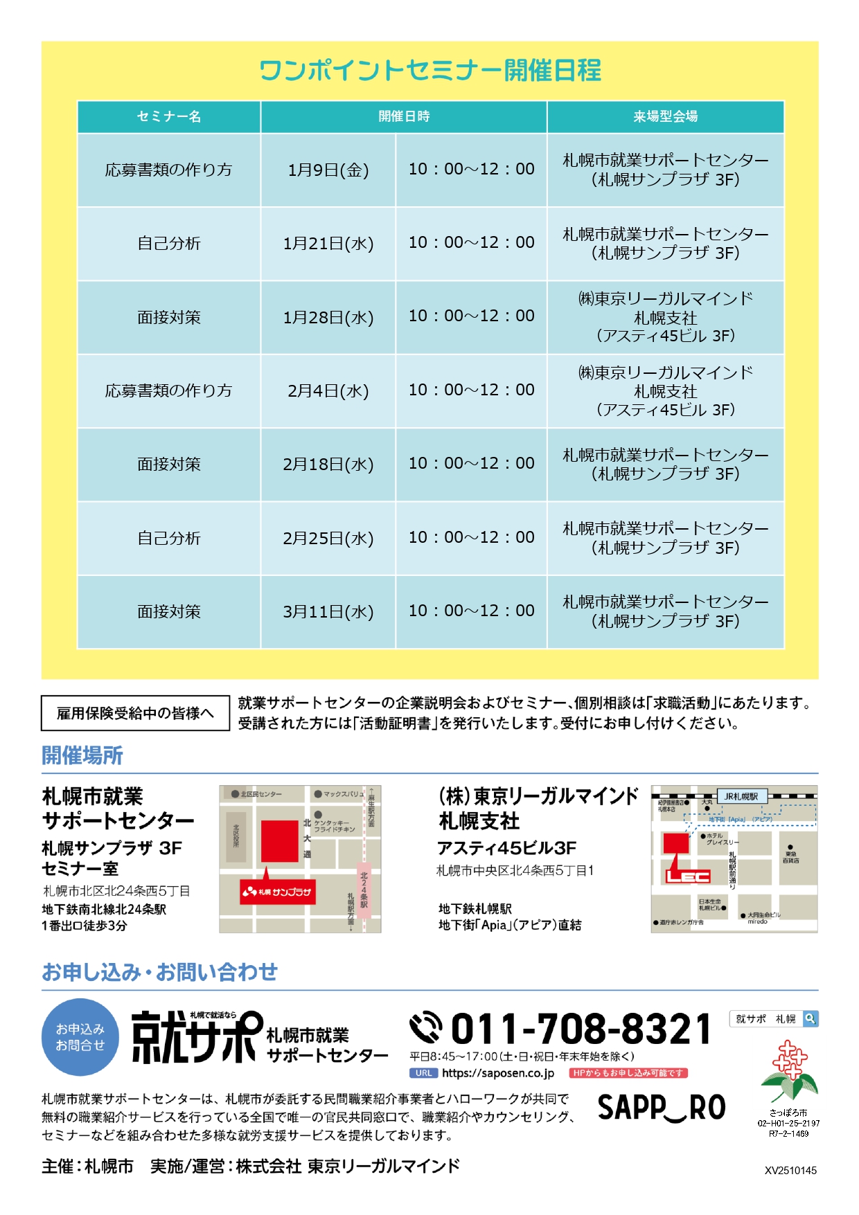 1/28(水)10:00~12:00 「面接対策」 2/4(水)10:00~12:00 「応募書類の作り方」 |